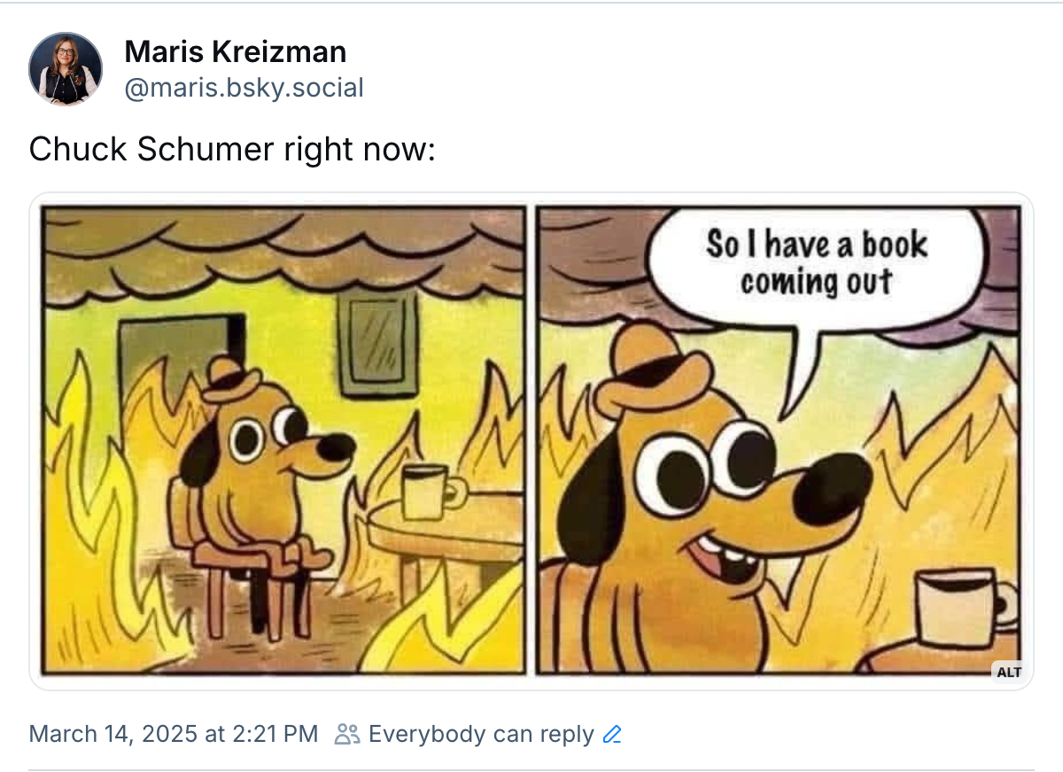 I did not mean for my Lit Hub column last week to be quite so timely, I promise. I wrote a screed about politicians shilling their silly books when, you know, our way of life as we know it is being decimated by the Trump administration. Chuck Schumer's new book, out today, is particularly odious, given that he's talking about the scourge of antisemitism as if Palestinian activists weren't being disappeared by our government. Really feeling like "never again" has become "never again for us." It's so demoralizing.