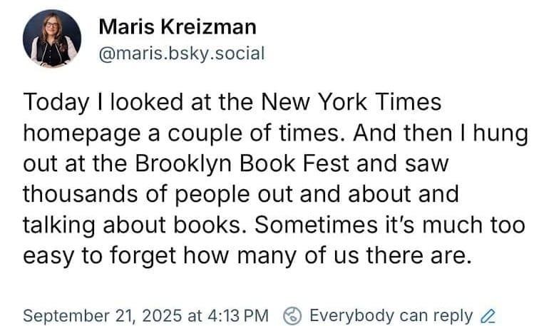 It was such good timing that the Brooklyn Book Festival fell on the same day as the Charlie Kirk memorial. If I was at home I would be reading, but then pausing my reading to look at my phone. My phone is full of little bombs.