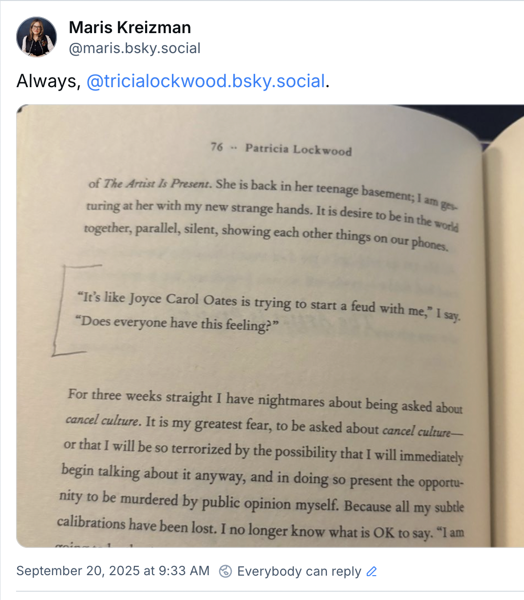 "'It's like Joyce Carol Oates is trying to start a feud with me,' I say. 'Does everyone have this feeling?'" – Patricia Lockwood
